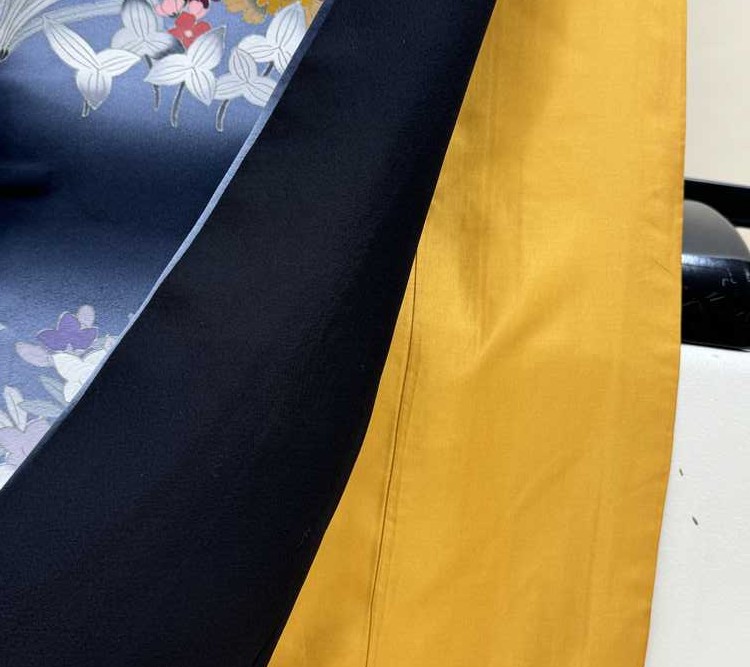 | 特徴 | 全体:黒地にねず色グラデ、春夏秋冬の花々。肩:花しだれ。フキ:黒。重ねフキ:からし色。ハッカケ:柄なし。柄::春夏秋冬の花々。 |